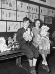 Avis E. Johnson Junior, holding a Polish doll, and Cecelia Zoden, holding a doll dressed like Betsy Ross. Avis E. Johnson Junior and Cecelia Zoden sitting on a bench holding dolls. Behind them are drawings of ethnic and national clothing types.