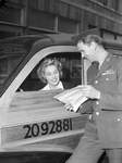 "Blue Streak" Liberator. Master Sergeant Richard E. Weizenegger, checking crew list with Frances Haynes, driver of Convair station wagon. Master Sergeant Richard E. Weizenegger showing Frances Haynes a paper while she sits in the car.