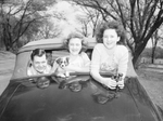 Spring scenes. Robert Cox, LoAnn Church and Dell Prather in automobile. Robert Cox, LoAnn Church and Dell Prather riding in automobile, looking out of the window while one of the women holds a puppy.
