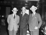 English commercial airmen. Left to right, Vernon Crudge, A. C. Campbell Orde and Lord Knollys. The men were concluding a tour of American transport plane factories and had stayed as guests of Amon Carter at the Fort Worth Club. Lord Knollys is chairman of the British Overseas Airway Corporation and was accompanied by A. C. Campbell Orde, Lord Knollys' assistant, and and Vernon Crudge of Baltimore, West Atlantic regional director for British Airways. The three men are standing next to each other and are wearing suits and Shady Oak Hats gifted to them by Amon Carter, photographed before their departure for Washington, D. C.
