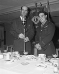 Major Frank J. (Spot) Collins (right) of Breckenridge, Texas, Army Air Force pilot, is introduced by President Law Sone of Texas Wesleyan College at the Lions Club luncheon.Major Collins is wearing his military uniform, displaying the ribbon bar with ranks and Army Air force wings. He has his cap in his right hand.''President Law Sone is standing at a microphone that is atop a dressed-banquet table. He is wearing a pinstriped, double-breasted, suit.Behind the men, is a Lions Club banner with emblem. The luncheon was held at the Hotel Texas. Published Fort Worth Star-Telegram Morning Edition March 29, 1944.
