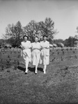Nurses' aides, standing left to right, Mrs. Ruby Musgrove, Mrs. Dana Ward, and Miss Mary Ann Burr. The three women are standing outside wearing their uniforms and have their arms linked together. Mrs. Ward is wearing spectacles. Published in the Fort Worth Star-Telegram.
