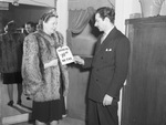 Mrs. Clyde Millican trying on silver fox fur as R. Koslow, furrier, looks at sales tag that reads "Silver Fox, $19.98, No Tax."