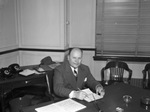 Jack H. Kultgen, new Fort Worth, Texas district Office of Price Administration director, sitting at a desk. He is wearing a suit and is holding a pencil and a cigar. On the desk are various documents. Behind him is another desk on which there are more documents, a hat and two telephones.