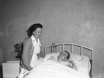 First Lieutenant Ruby L. Johnson, left, who arrived home on leave after two years as an Army nurse, tends to her mother, Mrs. J. W. Johnson, in bed, after a recent operation. Lieutenant Johnson is wearing her nurse uniform and a cardigan and is standing beside her mother. Mrs. Johnson is lying in bed and wearing eyeglasses. On a table beside the bed is a vase filled with flowers.