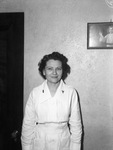 Lieutenant Ruby L. Johnson, Army nurse, standing in front of a wall and wearing her nurse uniform. Hanging on the wall behind her is a painting.