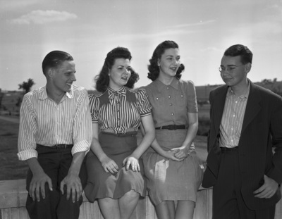 Arlington Heights High School senior play cast. Left to right, David Phillips, Jean Hoera, Isabell Smith all seated on a high ledge, and Ernest Allen, standing. The play is "Young April" a three-act comedy to be presented in the school auditorium. Published on May 15, 1940.