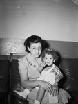 Denton, Texas citizens turned out to make blood donations to the Red Cross through the Fort Worth, Texas Blood Donor Center's mobile unit. Mrs. C. W. Milligan holds her 18-month-old daughter, Nancy Lee Milligan, as she awaits her turn as a blood donor. Mrs. Milligan is wearing a dress and spectacles. Miss Nancy Lee is wearing a striped t-shirt and overalls. Published in the Fort Worth Star-Telegram morning edition, April 5, 1944.