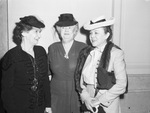 Attending the convention of the First District of the Texas Federation of Women's Clubs at Hotel Texas were, left to right, Mrs. J. Thomas Davis, of Stephenville Texas, Mrs. Stanley Boykin, of Fort Worth, Texas, and Miss Ethel Foster, of Sterling City, Texas. Mrs. Davis, district president, is wearing a dark-colored jacket and a hat. She has her eyeglasses on a chain around her neck. Mrs. Boykin is the federation president and convention chairman. She is wearing a blouse, skirt, hat and a broach. Miss Foster, state president, is wearing a skirt and blazer with a fur shawl. She is also wearing a hat and is carrying her purse under her arm.