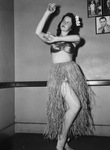 Sybil Olmsted, Texas Christian University (TCU) Co-ed, is one of the star performers in the musical revue "Curtain Time" at Carter Riverside High School at 8:15 pm., Thursday, benefiting De Molay building fund. Olmsted is posing in a hula dance position. She is wearing a grass skirt, bikini top and flowers in her hair. Published in The Fort Worth Star-Telegram evening edition, April 13, 1944.