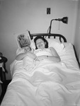 Mrs. Lloyd Boydstun, of 3004 Schadt, and infant daughter, Beverly Jane, are laying in a hospital bed with picture, of Private First Class Lloyd Boydstun, behind them. Mrs. Boydstun is in a sleeveless gown, wearing a wrist watch and laying her head on a pillow, with the bed sheet folded down, just past her chest. As her left arm rests on her stomach, her right arm is holding her newborn daughter, Beverly Jane, who is wrapped in a blanket. Boydstun is away in the military and has yet to see his baby daughter, Beverly Jane.