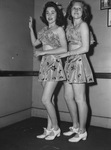 Elaine Lovelace of North Side School and Peggy O' Grady of Arlington Heights, to dance for DeMolay building fundraiser. Both girls are wearing a two-piece costume. The tops are covered in a ruffled material. The bottoms are shorts with wide openings. The fabric has chevrons and stars on it. They are wearing tap shoes. Peggy O'Grady has on an anklet. Both girls are turned towards the right, with their heads facing forward. They are wearing bows in their hair and are holding their right hands up with their left hands at waist height. Peggy has her hand on Elaine's waist. Published Fort Worth Star-Telegram Morning Edition April 13, 1944.