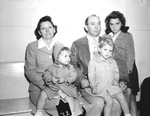 The American Red Cross Blood Donor Service mobile unit is visiting Henrietta, Texas. The Brooks family is visiting the mobile unit. Pictured here left to right, are Mrs. E. W. Brooks, Stanfield, holding Joan; Mr. E. W. Brooks, holding Anna Beth; and Patsy. The Brooks are a Gold Star Family, relatives of a United States military member who died in battle. They lost their son in a plane crash. Mrs. Brooks is wearing a collared blouse, blazer, and a matching skirt. Joan, sixteen months, is dressed in a bonnet and a coat. Mr. Brooks is wearing a suit. Anna Beth, three, is dressed in a coat. Patsy, ten, is wearing a collared blouse, jacket, and a skirt. Published in the Fort Worth Star-Telegram morning edition, April 7, 1944.