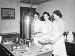 The American Red Cross Blood Donor Service mobile unit is visiting Henrietta, Texas. Working at the mobile unit, left to right are Mrs. A. C. Douthitt, Mrs. D. A. Greer, and Mrs. Eugene Hurn. They are drawing coffee for the canteen. The three women are wearing uniforms and aprons. There is a Coca-Cola cooler in the background. Published in the Fort Worth Star-Telegram morning edition, April 7, 1944.