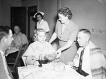 The American Red Cross Blood Donor Service mobile unit is visiting Henrietta, Texas. Visiting the mobile unit, left to right are, Nannie Catherine Howard, Mrs. W. J. Howard, and J. M. Gower. Nannie, Kiwanis sweetheart, donated blood. She is wearing a checkered blouse and a shawl over her shoulders. Mrs. Howard is serving canteen refreshments to her daughter, Nannie, and J. M. Gower of Charlie, Texas. Mrs. Howard is dressed in a button-up blouse and a skirt. Mr. Gower is dressed in a collared shirt, necktie, trousers, and a shawl over his shoulders. He has a son, Staff Sergeant (Sgt.) Stanley P. Gower, in the Army Air Forces in Missouri. Published in the Fort Worth Star-Telegram morning edition, April 7, 1944.