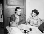 The American Red Cross Blood Donor Service mobile unit is visiting Henrietta, Texas to serve the surrounded Clay County communities. The unit is stationed outside First Methodist Church. Taking blood donations are Mr. and Mrs. Charles Schicht. Mrs. Schicht, registration chairman, is filling out a registration card for her husband. She is wearing a plaid button-up dress. Mr. Schicht is dressed in a button-up shirt and a leather jacket. He is wearing eyeglasses and his cowboy hat is on the table. He is an honorably discharged soldier. Published in the Fort Worth Star-Telegram evening edition, April 6, 1944.
