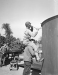 Army engineers Private Wilburn Foltz, of Sandova, Illinois, and Private Tommie Kincaid, of Houston, Texas, assembling a storage tank. Private Kincaid is sitting on Private Foltz's shoulders, tightening a bolt on the tank. Both men are wearing work uniforms. At the far left are two other men standing next to a sawhorse. In the background are several trees.