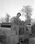 Master Sergeant Warren H. Yancy, of Nocona, Texas, Army engineer, adjusting the valves on the pump which serves a portable pipeline system. Master Sergeant Yancy is wearing a work uniform and a helmet. In the background there are a few trees and a row of shrubs.