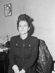 Mrs. Harry Brooks Baker, of 2625 Lubbock Avenue, who recently was elected president of the Euterpean Club. Mrs. Baker is wearing a dress suit, gloves, earrings and open-looped half hat. In her lap is an alligator clutch. She is sitting at a desk. Behind her on the wall is a portrait of a man. Published in the Fort Worth Star-Telegram morning edition, April 6, 1944.