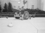 Captain Lloyd O. Thomas, of Claremore, Oklahoma, shown with the 155 mm Howitzer cannon he brought to the Army Service Forces exhibition from Fort Sill. Captain Thomas is wearing his military uniform and holding onto a lever of the howitzer. There are trees, a row of shrubs and a building in the background.