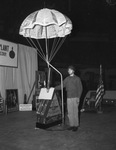 Parachutes; Military uniforms; Howitzers; War posters; Flags; Military personnel; Turner, T. J. (Pvt.); Shells (Ammunition); Will Rogers Memorial Coliseum; United States. Army