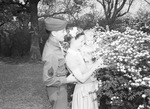 Staff Sergeant and Mrs. A. L. Shrum celebrated their second wedding anniversary by showing their son, Louis Wayne Shrum, the bridal wreath flowers now in bloom at Botanic Gardens. Sergeant Shrum is wearing his military uniform and standing beside him is his wife, wearing a dress and holding their son.