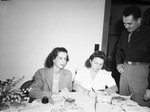 The Fort Worth, Texas Red Cross Blood Donor mobile unit launched a series of out-of-town stands, to include Decatur, Texas using the First United Methodist Church in Decatur as the headquarters. Lieutenant H. M. Mote, standing, watches Miss LaVada Gage, a teacher, center, write his name on the donor's honor roll, while his wife (left) looks on. Mrs. Mote and Miss Gage are sitting at a table. Mrs. Mote is wearing a blazer and blouse. Published in the Fort Worth Star-Telegram morning edition, April 9, 1944.