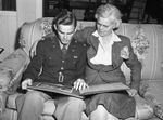 Major George Wessler Junior sitting on a couch with his mother, Mrs. George H. Wessler, of Arlington, Texas. He is showing her a scrapbook of pictures taken in the countries he visited. Major Wessler is wearing his military uniform and Mrs. Wessler is wearing a blouse, skirt, blazer and eyeglasses.
