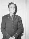 Major George Wessler Junior, just returned from five years in the South Pacific theater. He served in Java, Australia and New Guinea after going to Sumatra in 1939 as an employee of an oil firm. He is shown standing in front of a door, wearing his military uniform.