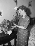 Mrs. S. J. Sherwood, Quarter Master Depot employee, admiring her Easter flowers that were sent to her, through the Red Cross, by her sons in the Southwest Pacific, Marine Corporal Sidney J. Sherwood, Jr. and Sam Porter Sherwood, seaman first class in the Seabees. Mrs. Sherwood is shown standing in a bedroom and wearing a polka dot dress with a decorative brooch. Her left hand is reaching towards the roses and wispy fern, holding one in her hand. Next to the roses is an Easter lily, both flowers are sitting on a narrow table. Underneath the table is a trash basket. On the wall is a silhouette drawing and a framed portrait of a man. The portrait is over a headboard and a bed with a geometric pattern bed cover. Published in The Fort Worth Star-Telegram morning edition, April 12, 1944.