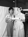 The Fort Worth, Texas Red Cross Blood Donor mobile unit launched a series of out-of-town stands, to include Ardmore, Oklahoma. Many donors crowded the temporary center and waited hours in long lines outside. Standing are Mrs. Grace Parker, a donor, left, a Native American, half -Chickasaw, wife of a paratrooper, and Mrs. Richard Patterson, nurses' aide. Mrs. Parker is wearing a blouse tucked into trousers and Mrs. Patterson is wearing her nurses' aide uniform. The two are smiling and holding a piece of paper. Published in the Fort Worth Star-Telegram evening edition, April 12, 1944.