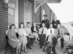 The Fort Worth, Texas Red Cross Blood Donor mobile unit launched a series of out-of-town stands, to include Ardmore, Oklahoma. Many donors crowded the American Legion Hall, temporary center and waited hours in long lines outside. Part of the waiting line outside, left to right, seated, Mrs. A. C. Whitehurst, Mrs. W. O. Whitehurst, Bill Knight, Mrs. R. G. Raines, Henry Beard, Leonard Damron and Royce Coe. Standing, N. H. Burkett, left, and Leo Adkins. Published in the Fort Worth Star-Telegram morning edition, April 14, 1944.
