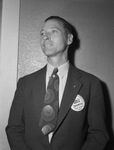 George N. Barton was presented with the Jaycee's Junior Chamber of Commerce key, as Man of the Month, The event was held at the Blackstone Hotel. Mr. Barton is wearing a suit with shirt and circular pattern tie. He has a small pin on his lapel and a large button, on his suit jacket, that reads "George N. Barton, Southland Life, Fort Worth, Texas." Published in The Fort Worth Star-Telegram morning edition, April 13, 1944.