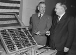 R. A. McGinnis, left, and Doctor W. G. Phillips, examining knives. The knives are in a case propped up by Mr. McGinnis, in front of an American flag. Both McGinnis and Phillips are holding a knife. Mr. McGinnis is in a three piece suit, with a diamond pattern tie, looking towards Doctor Phillips. Phillips is in a, three piece, pinstripe suit and tie. He has on eyeglasses and is facing towards McGinnis. There is a knife case and a couple of knives on the display table. Published in Fort Worth Star-Telegram, morning edition, April 13, 1944.
