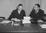 W. H. Randall, left, inspector-in-charge of the lend lease division, and Hamilton Morton, regional director of the four-state procurement setup. Both men are sitting at a large desk. On the desk is a telephone, ashtray, matches, a pen in a pen holder, a stapler, a wired file basket, and stacks of paper. Mr. Randall, in a three piece suit and diamond pattern tie, wearing eyeglasses, has his right hand on a notepad with a writing pen between his fingers. He is looking at the paper Mr. Morton is holding. Mr. Morton, in a three piece suit and dotted pattern tie, wearing eyeglasses, is facing towards Mr. Randall. There is a small United States map on the wall, behind them. Published in Fort Worth Star-Telegram, morning edition, April 13, 1944.