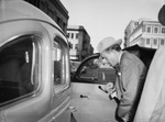 Wealthy Fort Worth, Texas rancher Winfield Scott getting into a car. He is wearing a suit and hat. He was arrested after a three-day search for him and is summoned to appear in Federal District Court at Laredo, Texas.