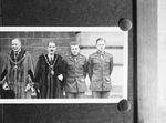 Sergeant Billie H. Emmons, right, was one of 48 American soldiers who were entertained March 23 by Lord Mayor of Nottingham, England, Frederick Mitchell, left, and Sheriff of Nottingham, England, Francis Carney, second from left. Standing second from right is an unidentified soldier. Sergeant Emmons and the other soldier are wearing their military uniforms and the Lord Mayor and Sheriff are wearing traditional dress and ornaments.