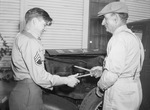 Staff Sergeant Hubert J. Womack, left, and his father, E. E. Teague, are working on family bus so Womack can get around to see his friends. Womack is in casual uniform with three chevron patch on right arm. He is reaching for a tool that his father is holding out. Mr. Teague, is wearing pants with suspenders, long sleeve shirt, and newsboy cap on his head. They are standing in front of the car's engine that is parked by the house. Published in Fort Worth Star-Telegram, morning edition, April 14, 1944.
