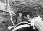 Sewer line tunnel. Inspecting pipe, W. A. Satterwhite (left) and R.U. Andrews. The two are standing in one of the torms around which concrete is blown in the 100-foot deep tunnel and inspecting the concrete that comes through. The tunnel is shown to be somewhat narrow, only being a few inches above the duo's heads. Mr. Satterwhite is wearing a jacket, a hat and a pair of eye glasses and Mr. Andrews is wearing a jacket. Behind the two are two other unnamed pipeline workers who are looking on.