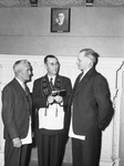 Three men who had leading roles in the ceremonies marking the 90th anniversary of Fort Worth, Texas Masonic Lodge Number 148 at the Masonic Temple were, left to right, C. C. Stevens, past master, G. L. Spotswood, worshipful master, and Walter H. Caldwell, speaker. They are wearing suits and Mr. Spotswood is wearing eyeglasses and is holding a book. Hanging on the wall behind them is a portrait of a man. They are wearing Masonic regalia.