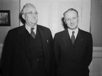 Plans for the 41st anniversary of the Monsignor Robert M. Nolan Council 759 of the Knight of Columbus are being formulated by James A. Leonard, right, grand knight, and George J. Kreyenbuhl, chairman of the arrangements committee. Both men are standing in front of a closed door and are wearing suits. Mr. Kreyenbuhl is wearing eyeglasses.