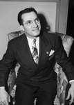 Eddie Schreiber of Galveston, was elected president of Retail Furniture Association of Texas at the closing session of the organization 21st annual convention at Hotel Texas. Approximately 700 delegates registered during the two-day convention. Mr. Schreiber is photographed sitting in a wing back chair, wearing a double breasted suit with tie and pocket square. He has a pin on his lapel and is wearing glasses. Published in the Fort Worth Star-Telegram morning edition, April 15, 1944.