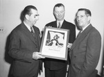 The first award issued through the Fort Worth, Texas Blood Donor Center to a firm for outstanding service is presented to I. C. Parker, president of Pangburn Corporation, right, by LeRoy Olmsted, Blood Donor Service chairman, left, Dick Noon, colonel of the Blood Donor recruiting committee, center, watches the exchange. The three men are standing and wearing suits. On the award is a picture of the American Red Cross flag. Published in the Fort Worth Star-Telegram morning edition, April 15, 1944.