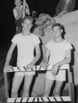 Track meet. Left to right, Dan Jordan and Grant Finnigan, Masonic Home track athletes posing by a hurdle with a boy in the background bending to get himself into the picture. Jordan finished first and Finnigan, 3rd in the 120 high hurdles; also, both earned a place in the 200 low hurdles. In these 2 events, Masonic Home earned 14 points. The Masonic Home's track and field athletes, scoring heavily in the hurdles and the jumps, won the District 7-AA championship, Friday night at Farrington Field. The Masons scored 45 point to beat our Paschal, which totaled 33. Published in the Fort Worth Star-Telegram morning edition, April 15, 1944.
