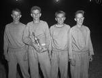 Winners for Masonic Home and School in the mile relay race at a district track meet were, left to right, Bobby Fain, Wallace Pankhurst, Guy Wilson, and C. D. Dorrah. The boys are standing next to each other, wearing matching sweatshirts and sweatpants. Pankhurst is holding the team's trophy and all four boys are smiling.
