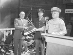 Arthur F. Hubbard, left, accepting flag for bond purchases from Colonel Wannie L. Bartley, right commanding officer of the depot, as Major General Richard Donovan looks on. Hubbard is in a double breasted suit, shirt, plaid tie, round framed eyeglass and two pins on his lapel. His right hand is on the American Flag. Colonel Bartley is wearing round framed eyeglasses, military uniform, with ribbon bar, and a mustache. Colonel Bartley is standing behind a podium, with microphone. His right hand is holding the flag. Major General Donovan is in his military uniform, wearing rimless eyeglasses. Behind them are military men, the American flag, and others sitting in chairs on the stage. Published in Fort Worth Star-Telegram, morning edition, April 16, 1944.