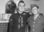 Tom W. Smith Junior, left, aviation radioman and gunner second class and his cousin, Staff Sergeant John A. Melvin. Smith and Melvin are visiting their aunt, Mrs. S. C. Smith, 3304 Avenue I. The two service men grew up together in Belton and attended Belton High School. Smith is the son of Mr. and Mrs. T. W. Smith and Melvin is the son of Mrs. John Melvin, both of Belton. Smith has participated in 39 missions including 25 bombing raids and 14 spotting and strafing sorties and has nearly 300 hours' combat flying time. He has three stars on his gunner's wings for contact with the enemy and three stars on his campaign ribbon, one for Bougainville and Solomons action, the other two can't be told. Melvin is on leave from Camp Carson, Colorado, where he is stationed with the Signal Corps. He has been in the Army 17 months. In this picture, they are standing, in military uniform with arms on each others shoulders. Behind them is a brick fireplace, mantle with framed portraits and mini donkey figurines. There is a framed mirror above the fireplace and a small framed painting. Published in Fort Worth Star-Telegram, morning edition, April 19, 1944.