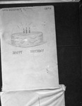Patsy Ann Manriquez, three year old girl, received a drawing of her birthday cake mailed by her father Lieutenant Raul Manriquez from a German prison camp. American fliers in the prison camp celebrate her birthday, for whom two famous Boeing B-17 Flying Fortresses are named after this tot. The drawing of her birthday cake has three lit candles. Text on drawing reads "Wednesday December 1, 1943. Happy Birthday". Published in the Fort Worth Star-Telegram morning edition, April 19, 1944.