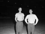 The Ice-Capades auditions are being held in Fort Worth, Texas. Pictured practicing on the rink, left to right, are Thomas Osborn and Bobby Spretch. Mr. Osborn is a native of Beaumont, Texas. He is dressed in a striped t-shirt tucked into trousers. Mr. Spretch is wearing a sweatshirt and trousers.