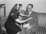 Party for Flem Hall and Bill Van Fleet. Flem Hall having rose pinned on his lapel. A woman sitting next to a man as she pins a rose on his shirt.